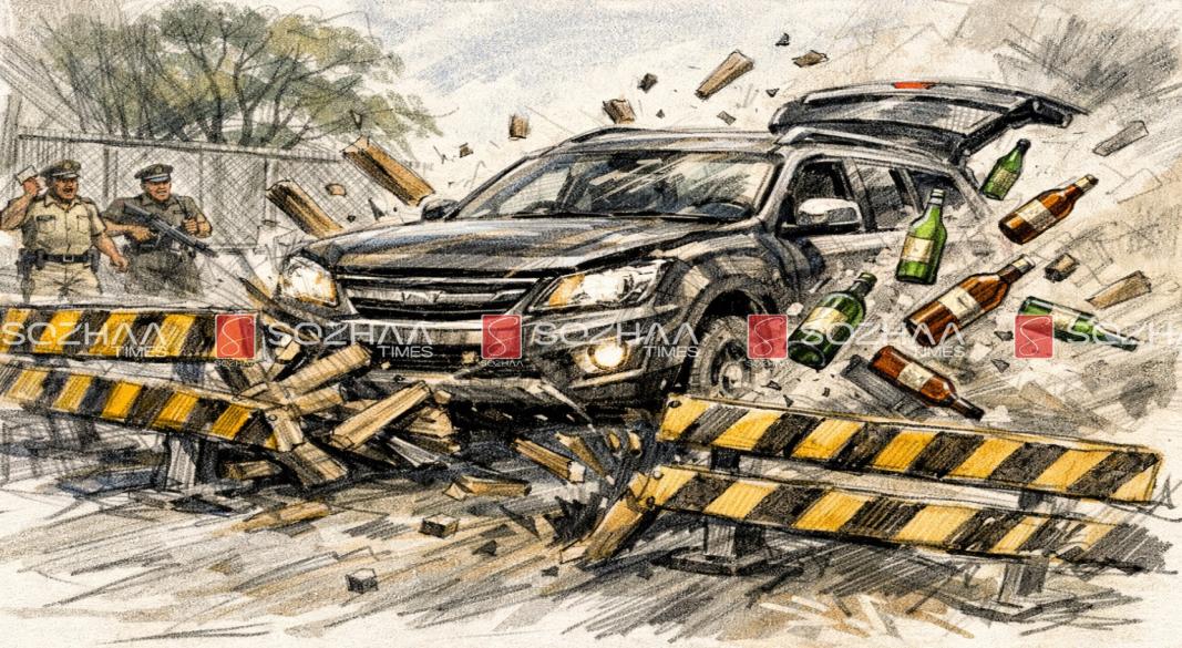 மதுக்கடத்தலை கட்டுப்படுத்தும் நோக்கில், அந்தப் பகுதியில் காவல்துறையினர் வாகன சோதனைக்காக தடுப்புகளை அமைத்திருந்தனர். அந்த நேரத்தில், அதிக வேகத்தில் வந்த ஒரு கார் தடுப்புகளை பொருட்படுத்தாமல் மோதி உடைத்துக்கொண்டு தப்பிச் சென்றதாக போலீசார் தெரிவித்தனர்.
